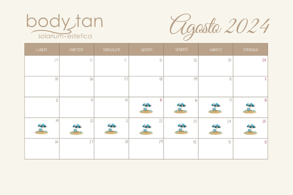 Vi comunichiamo che BODY TAN, resterà chiuso dal 15 al 25 Agosto 2024